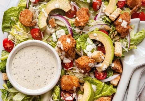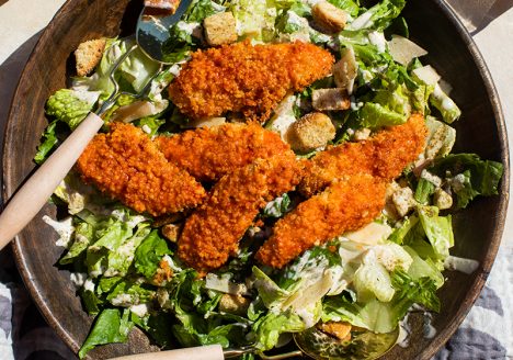 Hot Honey Chicken Caesar Salad Ingredients 1 Taylor Farms Caesar Salad Chopped Kit ½ kg boneless chicken breast tenders 2 eggs 1 ½ cup panko bread crumbs 1 ½ tsp kosher salt…